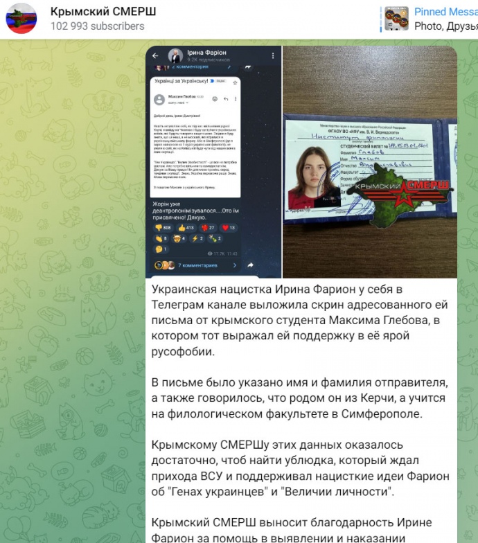 Зокрема, 8 листопада вона опублікувала скриншот листа проукраїнського студента 1 курсу з Криму Максима Глебова.