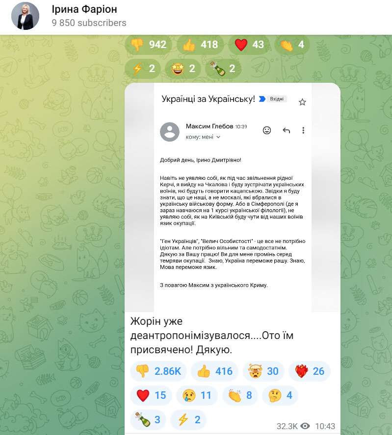 - Крім того, пізніше Фаріон опублікувала допис у своїх соцмережах, в якому заявила, що "воювати за Україну – це не заслуга, а обов'язок", а також назвала російськомовних захисників "москворотими".