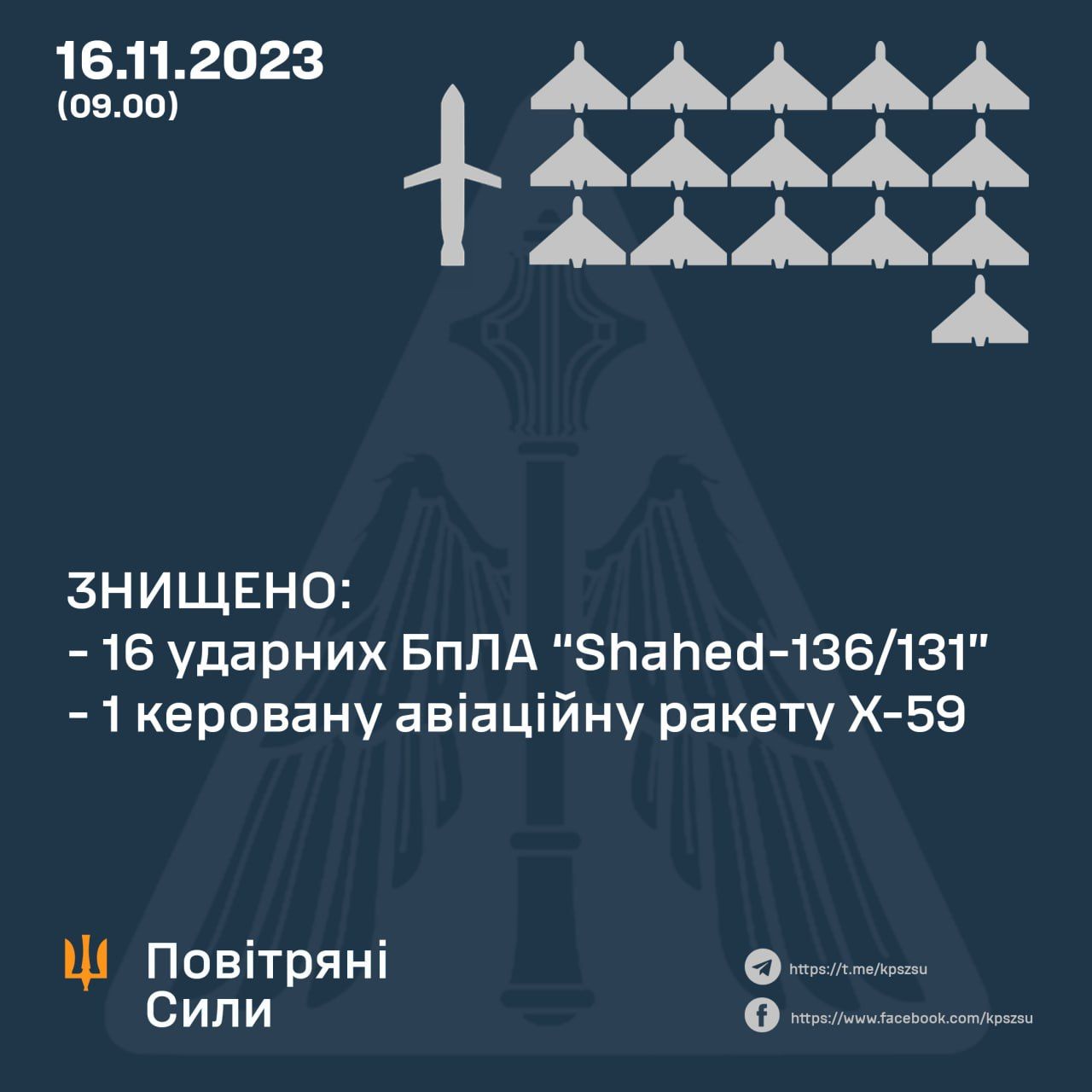 Сили й засоби Повітряних сил ЗСУ у ніч на 16 листопада знищили 16 із 18-ти ударних дронів Росії, ввечері також було збито авіаційну ракету Х-59 на Полтавщині, а Харківщина вночі зазнала атаки з С-300.