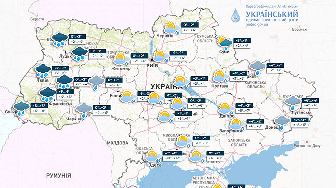 На решті території невеликі дощі. Вночі від -2° до +3°, вдень до +2+5°, у південних областях до +8°, на Одещині до +12°. Вітер вночі північно-західний з переходом вдень у південно-східний, 7-12 м/с.