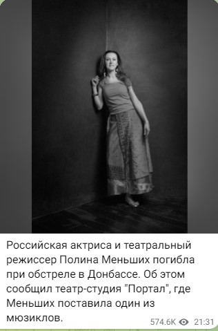 Деталі: Російські медіа 21 листопада повідомили про загибель акторки Поліни Меньших, яка виступала для російських військових у той день. "Російська акторка і театральний режисер Поліна Меньших загинула під час обстрілу в Донбасі. Про це повідомив театр-студія "Портал", де Меньших поставила один із мюзиклів", - написали в "РИА Новости".