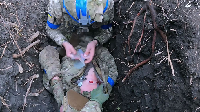 "Тут поранений. Треба місце, щоб я його оглянула. У нього ноги в крові… Танчик, лягай, лягай! Ми в оточенні, по нас ї**шать танками", − вигукує жінка-військова і при цьому надає допомогу пораненому.