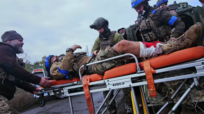 Деталі: Відео закінчується тим, що бійці разом з важким пораненим відходять до бронетехніки, виїжджають з поля бою і передають пораненого медикам, які вже чекають їх на дорозі.