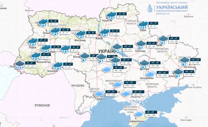 Дослівно УГМЦ: "30 листопада переважно без опадів, лише в північно-східних областях вночі невеликий сніг, на Закарпатті та Прикарпатті вдень помірний мокрий сніг, місцями налипання мокрого снігу; на дорогах країни, крім південного сходу, ожеледиця; температура вночі 3-8° морозу на заході країни до 11° морозу, у південно-східній частині країни близько 0°, вдень від 3° морозу до 3° тепла, на півдні країни до 6° тепла".