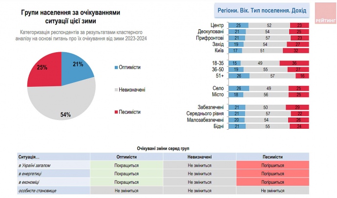 Загалом, 51% респондентів очікують, що ситуація загалом в Україні цієї зими залишиться незмінною, ще 25% очікують взимку на покращення, 21% − погіршення.