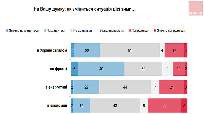Дослівно соціологи: "Очікування стосовно ситуації на фронті є найбільш оптимістичними: у покращення вірять 46%. За песимістичними очікуваннями лідирує економіка: 34% респондентів очікують на погіршення у цій сфері, 43% − не чекають жодних змін. Сфера енергетики оцінюється як така, що покращиться (17%) або залишиться без змін (43%)".