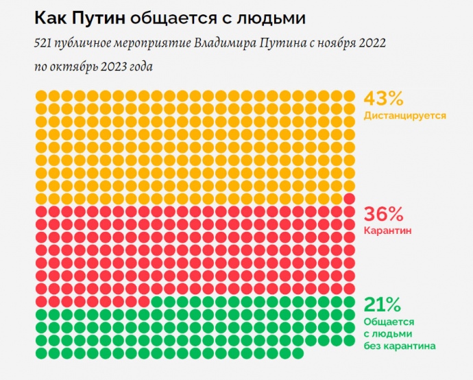Водночас п'ята частина (21%) усіх заходів за участю Путіна відбувалася без жодної дистанції та карантину − наприклад, із міжнародними гостями або після драматичний подій.