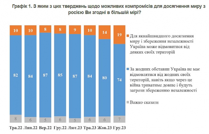 Після травня 2023 року простежується поступове зростання частки тих, хто готовий до територіальних поступок: з 10% у травні до 14% у жовтні і до 19% у грудні".