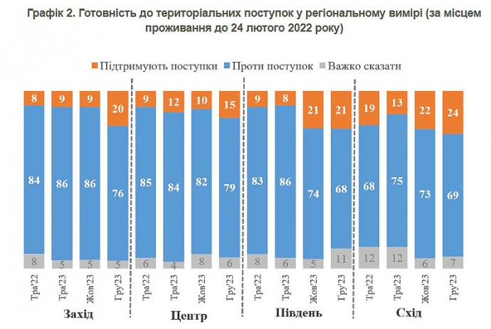 Соціологи звертають увагу: якщо між травнем і жовтнем 2023 року приріст частки тих, хто готовий до територіальних поступок, був переважно за рахунок Півдня і Сходу, то приріст між жовтнем і груднем – за рахунок Заходу і Центру.