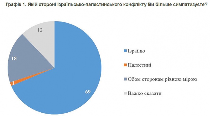 Дослівно соціологи: "69% українців симпатизують Ізраїлю. Лише 1% симпатизують Палестині. Водночас 18% респондентів відповіли, що вони в однаковій мірі симпатизують обом сторонам. Решта 12% не змогли визначитися зі своєю думкою".