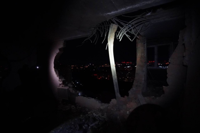 У Соломʼянському районі Києва внаслідок ворожого обстрілу у трьох квартирах частково зруйновані стіни на 24-26 поверхах та ще у трьох — вибиті вікна.