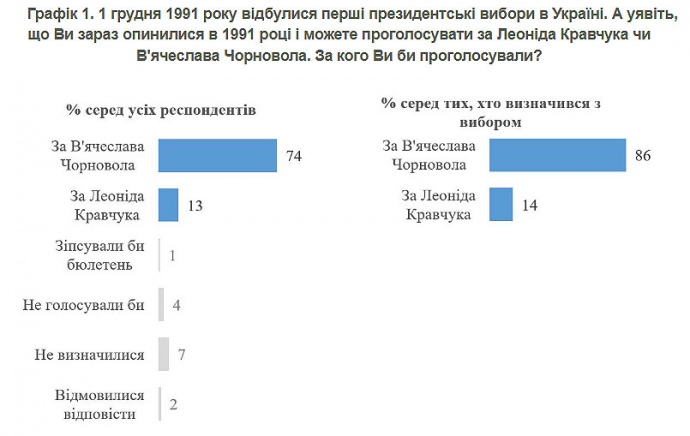 Дослівно КМІС: "Серед нинішніх українців зараз би 74% проголосували за В. Чорновола, а за Л. Кравчука віддали би свій голос 13%. У перерахунку до тих, хто голосував би і визначився з вибором, 86% голосів було би подано за В. Чорновола, 14% – за Л. Кравчука. Зокрема, серед респондентів, які дійсно в 1991 році мало право голосу (зараз це люди у віці 50 років і старше) 81% проголосували б за В. Чорновола і 10% – за Л. Кравчука".