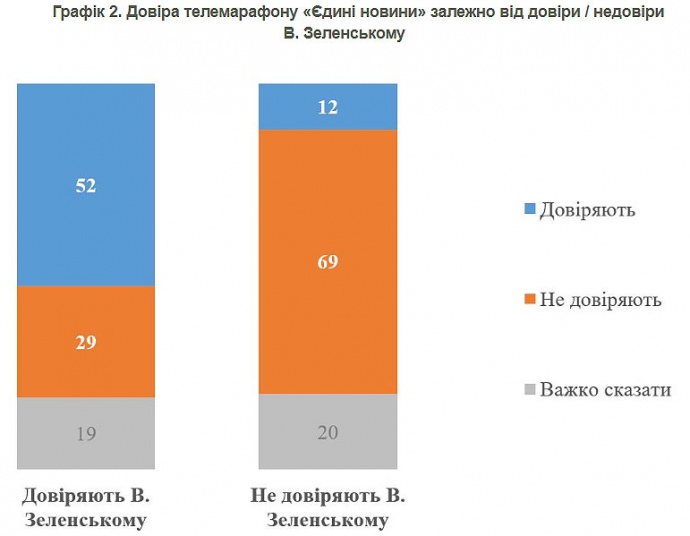 Ті, хто не довіряє Володимиру Зеленському, значно більш критичні до телемарафону, але і серед тих, хто довіряє президенту, марафону не довіряють 29% (довіряють 52%, не визначилися – 19%).