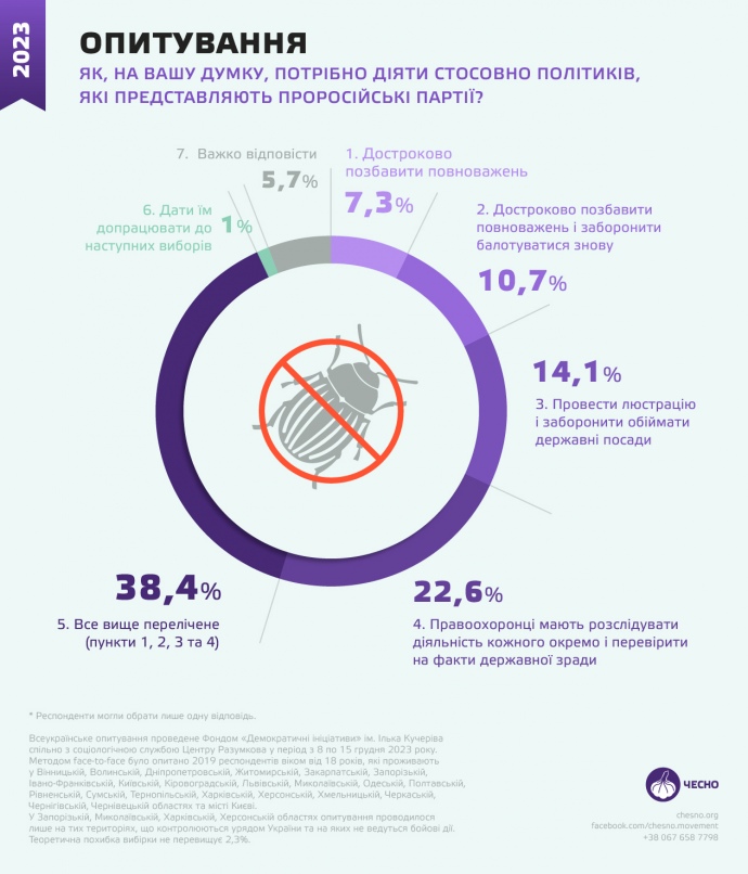За люстрацію і заборону займати посади для представників заборонених партій виступають 14% українців. А от розслідування правоохоронцями діяльності кожного окремо і перевірки на факти державної зради вважають вдалим варіантом 23% громадян.