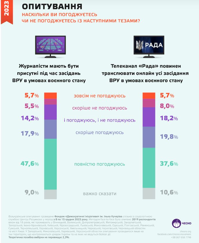 Деталі: Згідно з опитуванням, не погоджуються з тезою про необхідність доступу журналістів до засідань 11% українців, а з необхідністю трансляції не згодні близько 14% громадян.