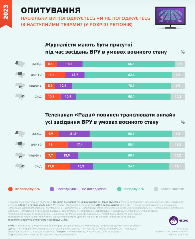 Щодо регіонального розрізу, то позиція всіх регіонів дуже схожа. Відмінним є лише відсоток мешканців східних та центральних регіонів, що не погоджуються з необхідністю відкрити журналістам доступ до парламенту та відновити онлайн-трансляції телеканалу "Рада", що можна пояснити безпековими питаннями.