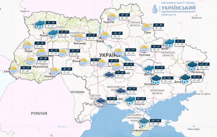 Дослівно УГМЦ: "19 січня у південній частині, східних та Дніпропетровській областях дощі, температура вночі 1-6° тепла, вдень +4°…+9° на крайньому півдні країни до 12° тепла; на решті території дощ та мокрий сніг, на Закарпатті значні опади, температура протягом доби від 4° тепла до 2° морозу. Вітер південно-західний з переходом на північно-західний, 5-12 м/с".