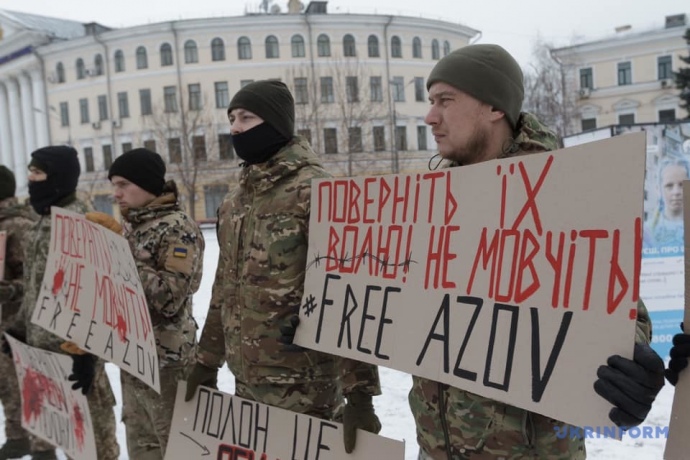 Близько 100 учасників тримали плакати "Поверніть їх волю! Не мовчіть! Free Azov!", "Боріться за них, як вони боролись за вас!", "Ми не в полоні завдяки тим, хто зараз там", "Україна чекає своїх героїв з полону - додому" тощо.