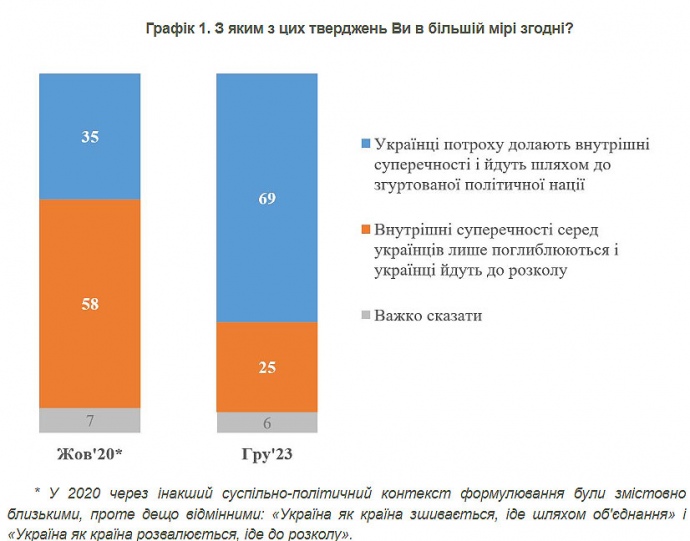 Дослівно КМІС: "Після широкомасштабного вторгнення погляди українців кардинально змінилися. На кінець 2023 року більшість українців – 69% – дотримувалися думки, що українці потроху долають суперечності та йдуть шляхом до згуртованої політичної нації. Частка тих, хто бачить поглиблення суперечностей і розкол, скоротилася до 25%. Решта 6% не змогли визначилися зі своєю думкою".