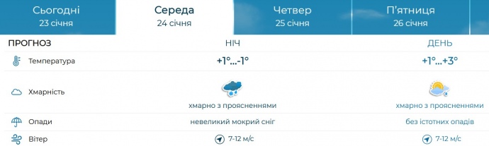 У середу 24 січня в більшості областей України мокрий сніг, іноді з дощем. Температура протягом доби від 2° морозу до 3° тепла.