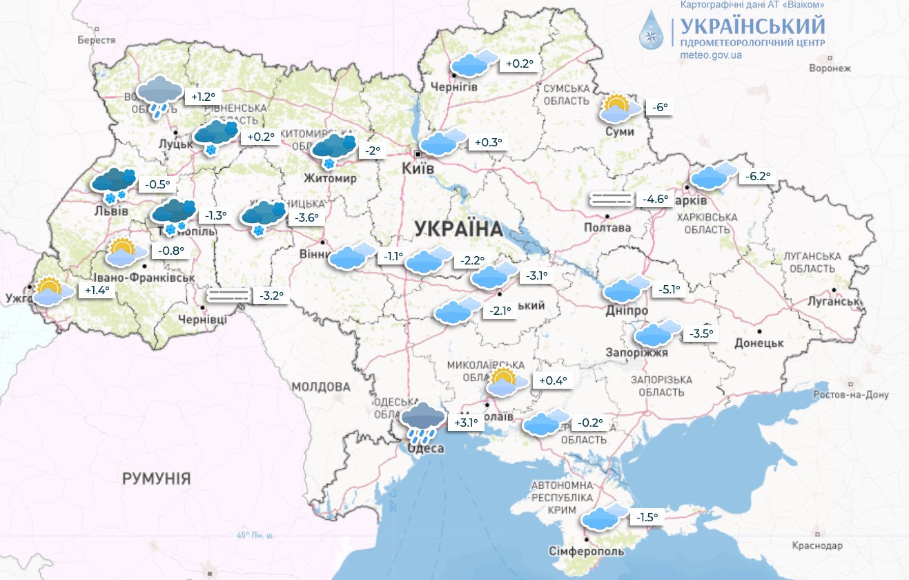 Температура протягом доби від 2° морозу до 3° тепла (вночі на Лівобережжі 1-6° морозу, у східних областях та в Карпатах до 10° морозу, вдень на Прикарпатті, Одещині та в Криму 1-6° тепла).