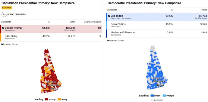 У вівторок колишній президент США і претендент на цю посаду від Республіканської партії Дональд Трамп переміг однопартійку Ніккі Гейлі на праймеріз у штаті Нью-Гемпшир, від Демократичної партії в цьому штаті переміг Джо Байден.