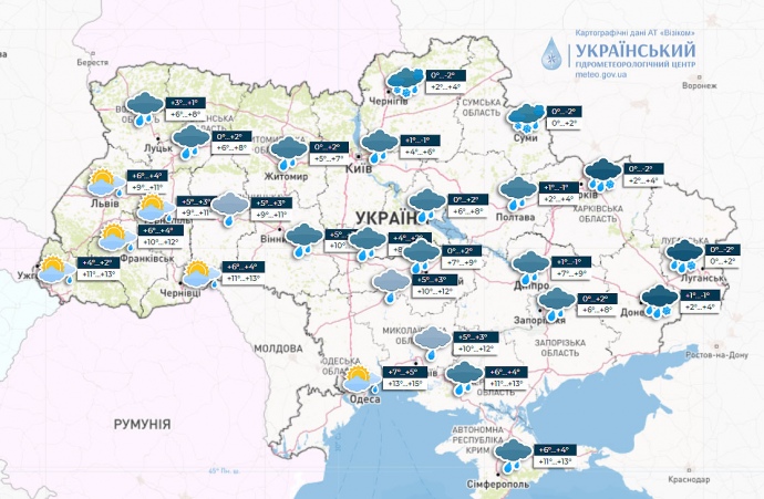 В Україні дощитиме, на півдні вдень до +17
