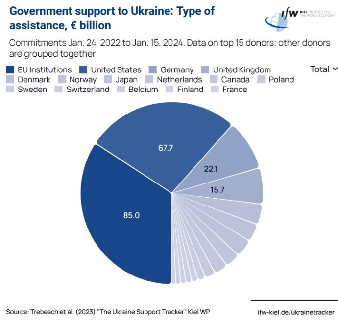Якщо ж розглядати надану та обіцяну Україні допомогу у фінансовій, гуманітарній та військовій сферах в мільярдах євро, то тут на першому місці - Євросоюз, який виділив загалом 84,99 млрд євро (77,18 млрд - фінансова допомога, 2,21 млрд - гуманітарна, 5,6 млрд - військова). Другим найбільшим спонсором України є Сполучені Штати із загальним обсягом 67,71 млрд євро допомоги (24,03 млрд - фінансова, 1,45 млрд - гуманітарна, 42,22 млрд - військова). На третьому місці - Німеччина з 22,06 млрд євро наданої допомоги та зобов’язань станом на 15 січня цього року (1,41 млрд - фінансова допомога, 2,95 млрд - гуманітарна, 17,70 млрд - військова).