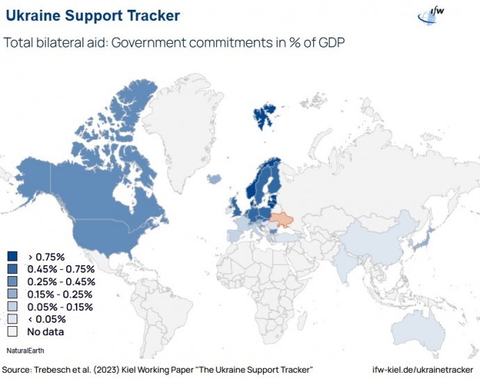Загальний обсяг допомоги та зобов’язань Німеччини з підтримки України становить 0,57% від її ВВП, Великої Британії - 0,55%, Сполучених Штатів - 0,32%, Франції - 0,07%. Нейтральні Швейцарія та Австрія виділили на підтримку України 0,33 та 0,18% відповідно.