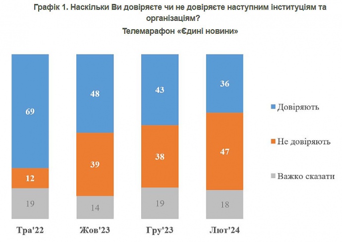 Так, у грудні 2023 року 43% довіряли телемарафону "Єдині новини", не довіряли – 38%. Станом на початок лютого 2024 року частка тих, хто довіряє, знизилася до 36%. Натомість до 47% зросла частка тих, хто не довіряє".