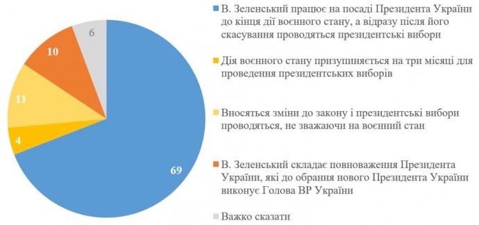 Дослівно: "Переважна більшість українців – 69% – вважають, що Зеленський має працювати на посаді президента до кінця воєнного стану.