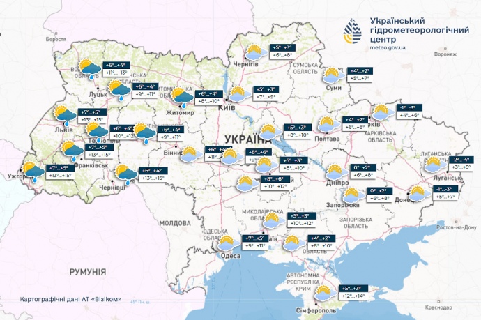 Температура вночі 1-7° тепла, вдень 6-13°, на Прикарпатті, Одещині та в Криму до 15° тепла; у східних, Сумській, Полтавській та Запорізькій областях вночі від 2° тепла до 4° морозу, вдень 2-9° тепла.