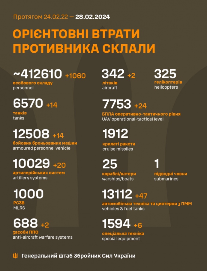 Деталі: Загальні бойові втрати противника з 24.02.22 по 28.02.24 орієнтовно склали:
