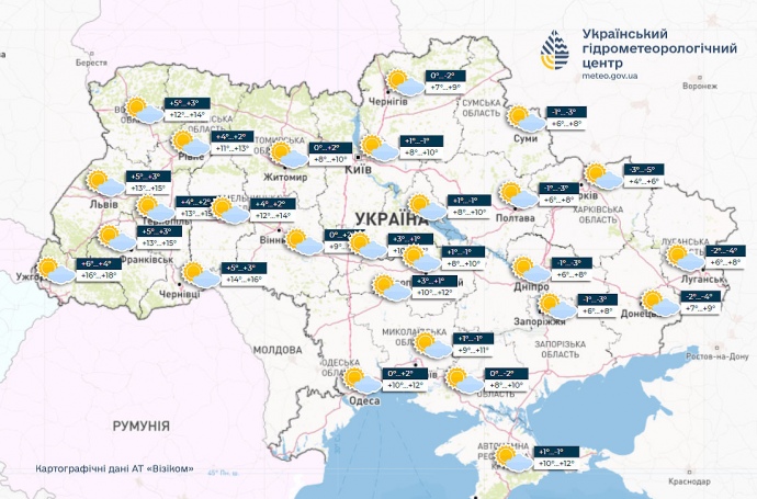 Температура у західних областях вночі від 5° тепла до 1° морозу, вдень 10-16° тепла, на Закарпатті 14-19°; на решті території вночі від 1° тепла до 4° морозу, у східних областях 2-7° морозу, вдень 6-11° тепла, на Одещині та в Криму до 14°".