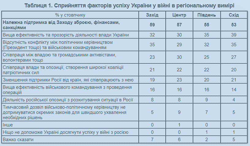 Більшість українців – 57% – вважають, що найбільш важливим фактором успіху України у протистоянні Росії є належна підтримка Заходу зброєю, фінансами, санкціями.