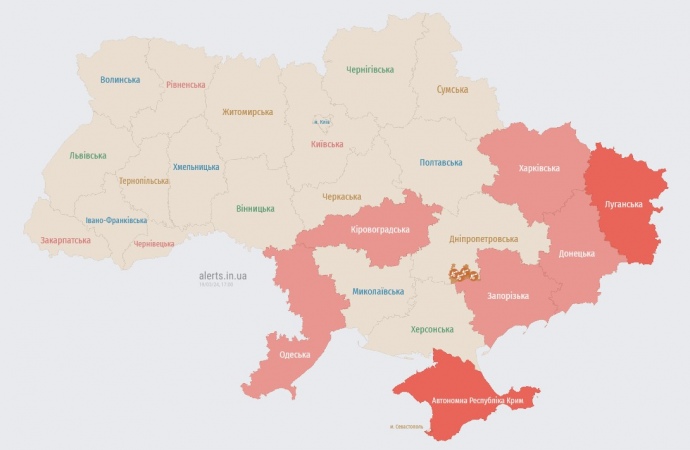 Станом на 17:00 тривога звучить лише в Одеській, Кіровоградській, Харківській, Запорізькій, Донецькій, Луганській областях і в окупованому Криму.