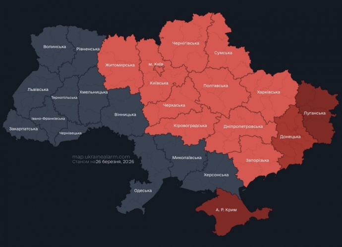 У низці українських областей повідомляли про повітряну тривогу через загрозу балістики ввечері 26 березня.