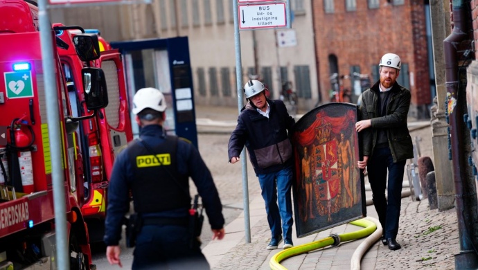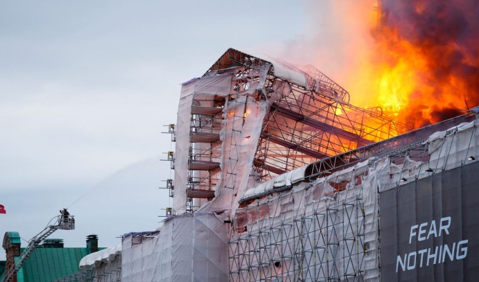 У столиці Данії, Копенгагені вранці 16 квітня виникла масштабна пожежа у будівлі копенгагенської біржі Берсен, де зберігаються твори мистецтва, спіральний шпиль на даху вже обвалився.