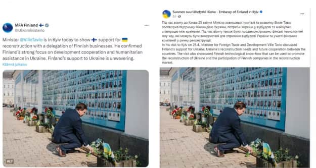 Деталі: Візит міністра зі співпраці розвитку та зовнішньої торгівлі Вілле Тавіо до Києва відбувся в середині минулого тижня. Розповідаючи про нього, МЗС Фінляндії та посольство опублікували на своїх сторінках фото Тавіо біля стін Михайлівського золотоверхого монастиря у Києві, де він вшанував пам’ять загиблих захисників України.