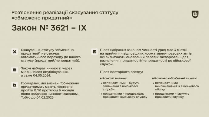Деталі: 3 квітня було опубліковано підписаний президентом Володимиром Зеленським закон № 3621-IX, який, зокрема, передбачає скасування статусу "обмежено придатний".