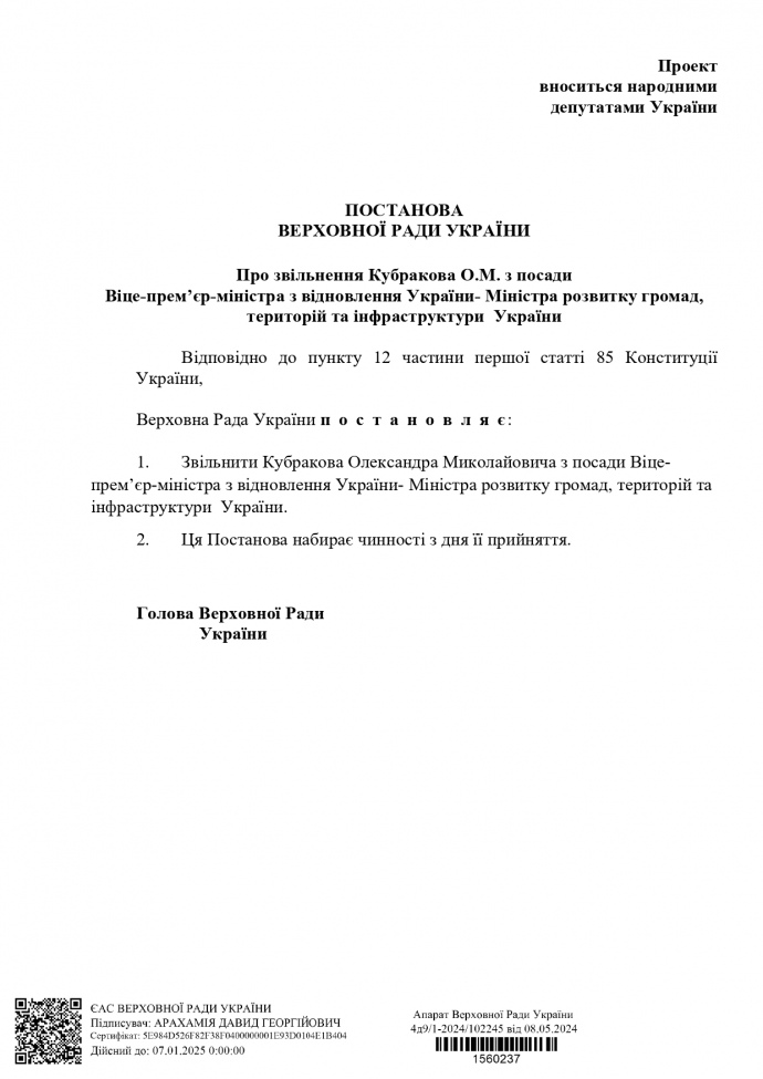У Верховній Раді зареєстрували проєкт постанови про звільнення Олександра Кубракова з посади віцепремʼєра з питань відновлення України – міністра розвитку громад, територій та інфраструктури.