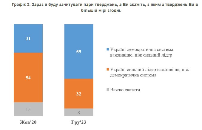 Подібне запитання ми ставили у жовтні 2020 року, проте без акценту "зараз", тобто запитували, що в цілому має бути пріоритетом. На той момент 54% віддавали перевагу сильному лідеру і 31% – демократичній системі (що, відповідно, схожу на потреби "зараз" за опитуванням у липні 2022 року). Натомість у грудні 2023 року більшість українців (59%) відповіли, що Україні демократична система важливіша. Частка тих, хто вважав, що Україні важливіше мати сильного лідера – 32%".