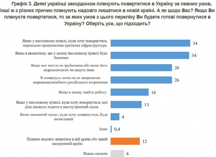 Деталі: Говорячи про умови, за яких українці готові повернутися додому, відносно найбільше респондентів назвали нормальну роботу критичної інфраструктури (34%) і безпеку (34%).