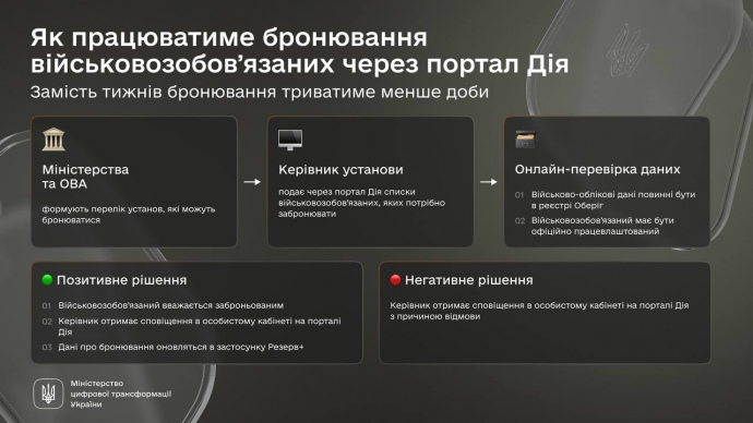 На першому етапі бронювання в Дії працюватиме для критично важливих підприємств і тих, які забезпечують потреби Сил оборони. Далі перелік розширюватиметься".