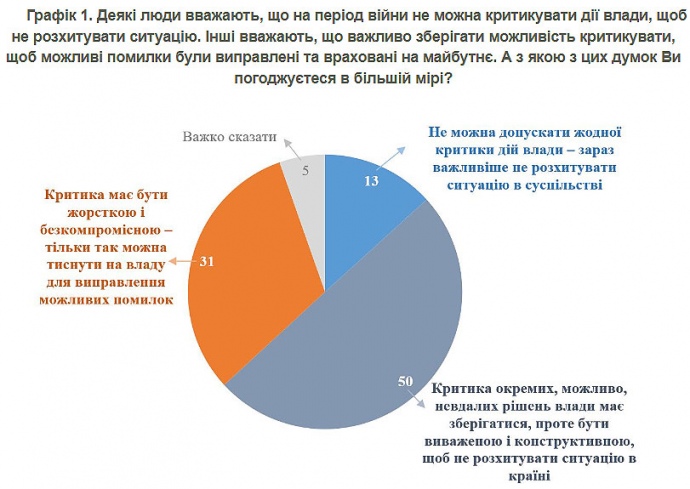 Українці вважають, що владу треба критикувати навіть під час війни, але при цьому 50% переконані, що допустима лише конструктивна критика, щоб не розхитувати ситуацію в країні, а 31% вважає, що дорікати владі можна жорстко і безкомпромісно, бо тільки так можна уникнути можливих помилок.