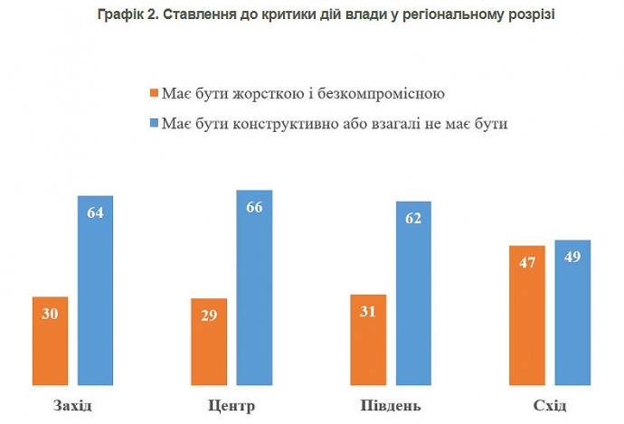 Деталі: КМІС відзначає, що ситуація досить подібна на Заході, в Центрі і на Півдні, де більшість (62-66%) вважають, що критика має бути в конструктивних рамках або взагалі відсутньою.