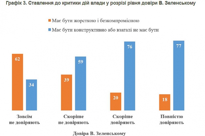 Соціологи також відзначають, що серед тих, хто скоріше не довіряє президенту, ситуація змінюється на протилежну: 59% наполягають на конструктивних рамках для критики (або взагалі проти неї), а 39% підтримують жорстку безкомпромісну критику.