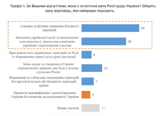 Дослівно: "Більшість українців – 60% – вважають, що Росія прагне знищити українську націю (34%) або навіть здійснити фізичний геноцид більшості населення (26%). Ще 6% українців вважають, що Росія хоче підкорити всі території, хоча і лишити їм певну культурну автономію в складі Росії.