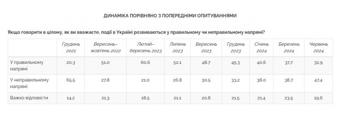 Деталі: За даними опитування, проведеного з 6 до 12 червня, частка тих, хто вважає, що події в Україні розвиваються у правильному напрямі, є меншою, ніж частка тих, хто дотримується думки, що вони розвиваються у неправильному напрямі (відповідно, 33% і 47%).