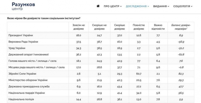 При цьому "особистісний" рівень довіри до В. Зеленського перевищує "інституційний" рівень довіри до Президента України (президенту як соціальному інституту довіряють 50% опитаних).